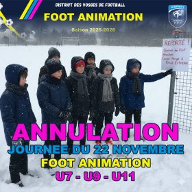 En raison des conditions météorologiques défavorables (froid et neige), nous sommes contraints d’annuler la journée de Foot Animation prévue ce samedi 22 novembre pour l’ensemble des catégories (U7, U9 et U11).
